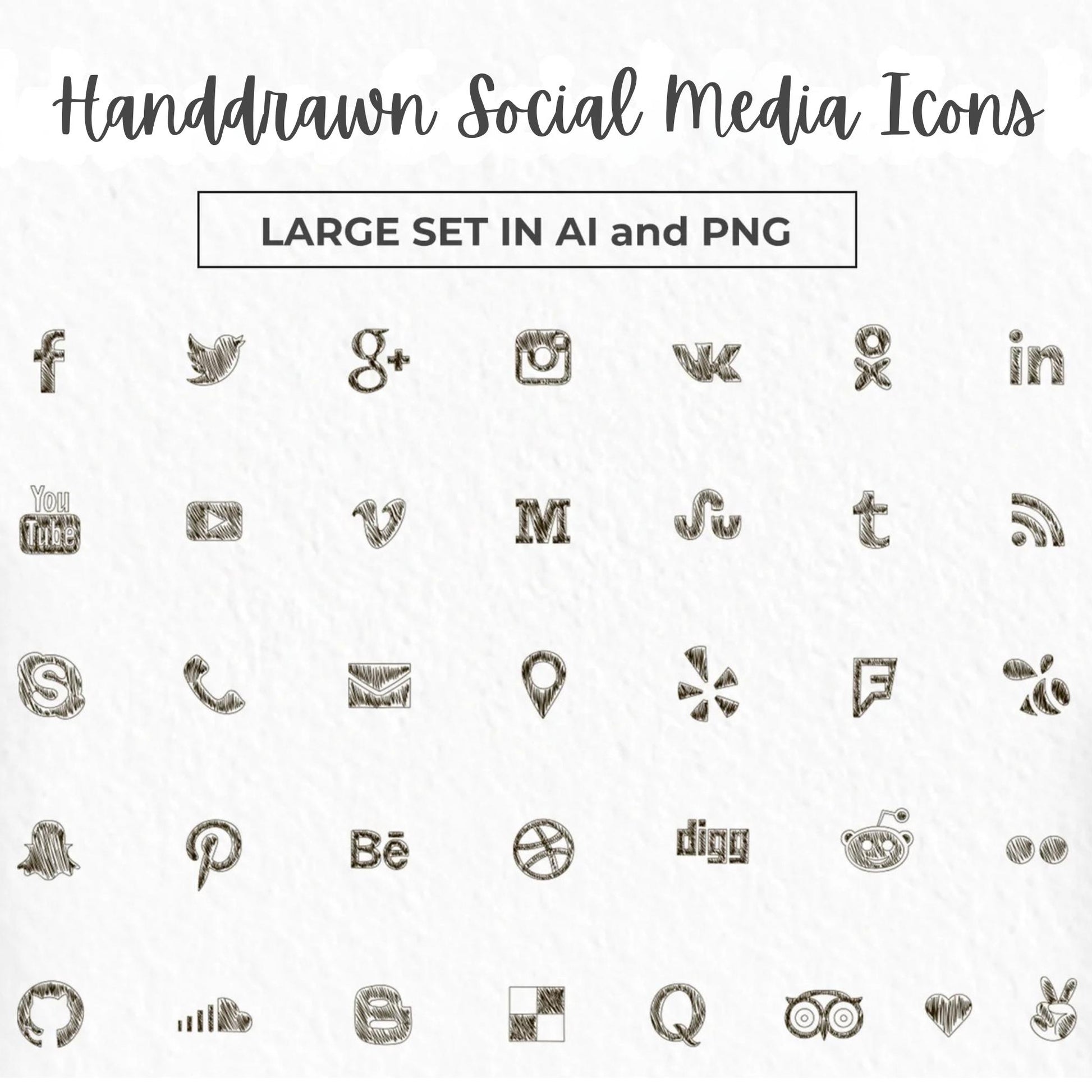 36 outlined + 36 sketched social media icons in PNG (transparent background), AI, and EPS formats. Includes Russian social networks (Vkontakte, Odnoklassniki) and all major platforms like YouTube, Pinterest, Behance, LinkedIn, and Snapchat.