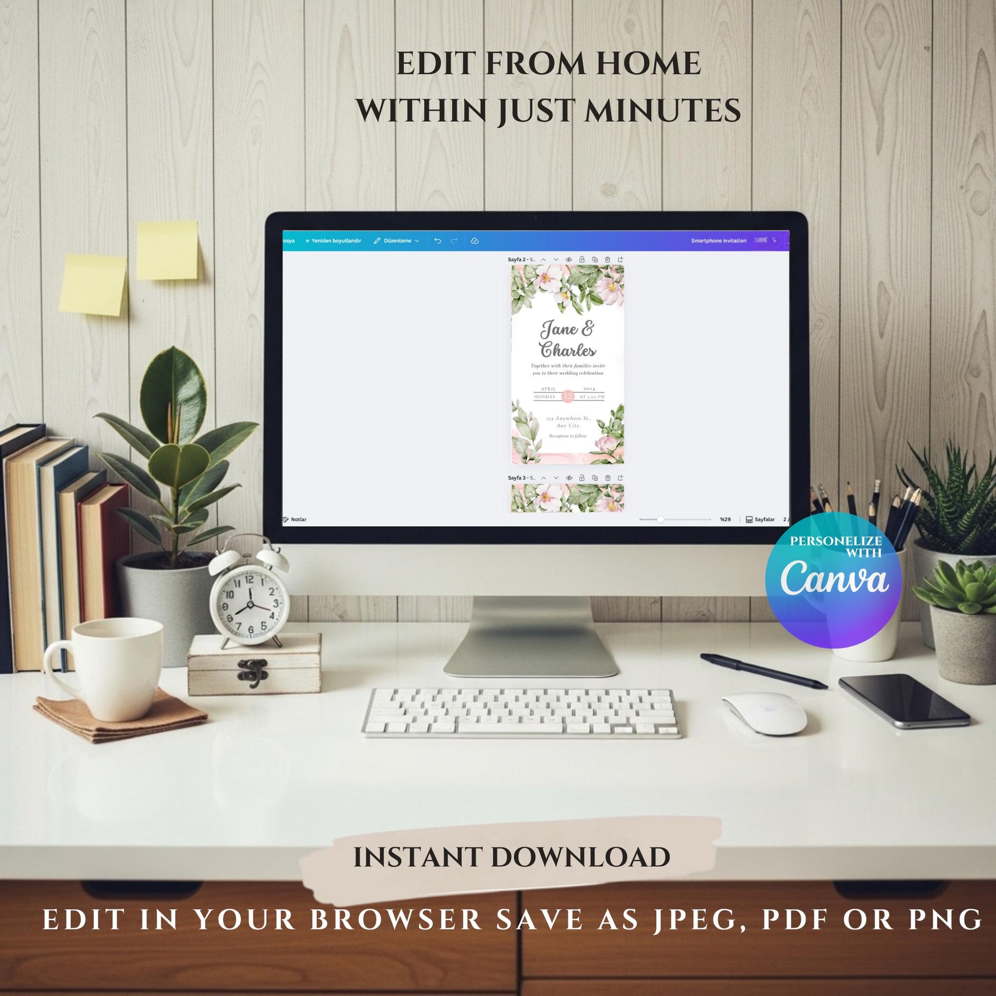 Perfect for the eco-conscious couple, this digital invite is easy to customize in Canva and send via smartphone, email, or social media. No software needed, edit instantly from your browser!
